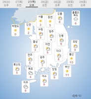 목요일인 27일은 전국에 가끔 구름이 많겠다.이날 전국은 중국 북부지방에 위치한 고기압의 가장자리에 들겠다.기상청은 "전라 서해안과 제주도에는 바람이 강하게 불겠으니 시설물 관리와 안전사고에 유의해야 한다"고 당부했다.이어 기상청은 "서해 먼바다와 제주도 남쪽 먼바다에