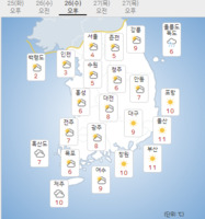 화요일인 25일은 전국이 대체로 흐린 가운데 중부지방에 적은 양의 비 또는 눈이 내리겠다.이날 전국은 북쪽을 지나는 기압골의 영향을 받겠다.기상청은 "오후부터 밤사이 강원 영서와 충북에도 비 또는 눈이 오는 곳이 있을 것"이라면서 "제주도에는 오후부터 비가 내리겠다"고