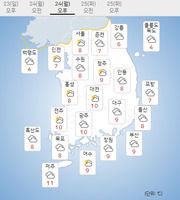 월요일인 24일은 전국에 가끔 구름이 많고 포근한 날씨가 이어지겠다.이날 전국은 동해북부해상에 위치한 고기압의 영향을 받겠다.기상청은 "강원 영동과 경북 북동 산지, 경북 동해안에는 오전까지 비 또는 눈이 내리고, 오후부터 밤 사이에는 빗방울 또는 눈 날림이 있겠다"고
