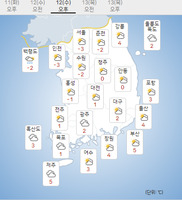 수요일인 12일은 충남권과 전라권, 제주도는 대체로 흐리고 그 밖의 지역은 오후부터 차차 흐려지겠다.이날 전국은 중국 북부지방에서 확장하는 고기압의 가장자리에 들겠다.기상청은 "경기 북부와 강원내륙·산지에서 아침 기온이 영하 15도 이하, 그 밖의 중부지방은 영하 10