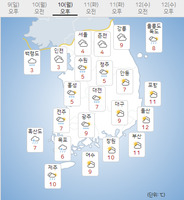 월요일인 10일은 전국에 구름이 많다가 오후부터 중부지역을 중심으로 눈이 내리겠다.이날 전국은 중국 북부지방에 위치한 고기압의 가장자리에 들겠다.기상청은 "눈은 저녁부터 수도권과 충남 북부에서 내리기 시작해 늦은 밤 수도권 북부와 경기 남부, 충청 북부·강원 영서로 확