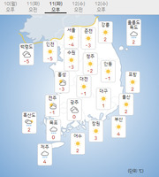 화요일인 11일은 전국이 기압골의 영향에서 벗어나 중국 북부지방에서 확장하는 고기압의 영향을 받겠다. 대체로 맑겠으나 충남과 전라·제주를 중심으로 흐린 날씨가 이어지겠다.이날 전국은 중국 북부지방에 위치한 고기압의 가장자리에 들겠다.기상청은 "전라 서해안과 제주에는 비