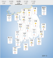목요일인 30일은 전국이 대체로 맑다가 낮부터 흐려지겠다.이날 전국은 서해상에서 남동진하는 기압골의 영향을 받겠다.기상청은 "오늘(30일)부터 내일(31일) 오전 사이 서해안과 경상권동해안, 제주도에는 바람이 35~60km/h(9~16m/s), 순간풍속 70km/h(2