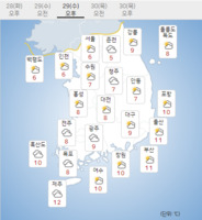 수요일인 29일은 전국에 구름이 많겠다.이날 중부지방은 북쪽을 지나는 기압골의 영향을 받다가 차차 벗어나겠고, 남부지방은 일본 남쪽해상에 위치한 고기압의 가장자리에 들겠다.기상청은 "오늘(29일)과 내일(30일) 서해안과 강원산지, 제주도에는 바람이 30~45km/h(