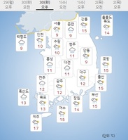 화요일인 30일은 전국에 비가 내리면서 기온이 급격하게 떨어지겠다.이날 전국은 중국 산둥반도 부근에서 북동진하는 저기압의 영향을 받겠다.기상청은 "비는 새벽에 서쪽 지역부터 시작해 아침에는 전국 대부분 지역으로 확대되겠다. 해안지역은 오후부터 차차 그치겠다"고 밝혔다.