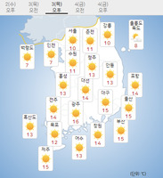 목요일인 3일은 전국이 대체로 맑겠다.이날 전국은 중국 상하이 부근에서 동진하는 고기압의 영향을 받겠다.기상청은 "내일(4일)까지 아침 기온은 평년(최저기온 -5~4도)보다 낮아 춥겠으나, 낮에는 기온이 오르면서 낮 기온은 평년(최고기온 7~12도)과 비슷하거나 높겠다