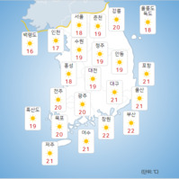 목요일인 28일은 전국이 맑겠으나 남부지방은 구름 많겠다.이날 전국은 중국 북동지방에 위치한 고기압의 영향을 받겠다. 이에 따라 전국은 전날(27일)보다 2~7도 낮은 5도 내외로 쌀쌀하겠다.기상청은 "내륙을 중심으로 서리가 내리겠고, 강원내륙과 선지에는 얼음이 어는