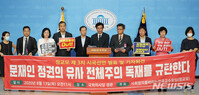 '한국보수주의연합(KCPAC)' 등 우파 시민단체가 1일 오전 서울 중구 프레스클럽에서 미국 하원의원이 발의한 '한반도평화법' 철폐를 촉구하는 기자회견을 열었다. 이날 기자회견에는 고영주 KCPAC 공동의장과 이동복 북한민주화포럼 대표, 이석우 전 국무총리비서