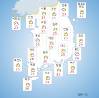 토요일인 25일은 전국 대부분 지역이 맑고 선선하겠다. 이날은 전국이 동해 북부 해상에 위치한 고기압의 가장자리에 들겠다. 이에 따라 전국에 구름이 가끔 많겠고, 강원 영동과 경상권 동해안은 대체로 흐리겠다. 기상청은 "대부분 지역의 아침 기온은 15