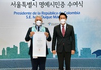 서울을 방문한 이반 두케 마르케스(Ivan Duque Marquez) 콜롬비아 대통령이 '서울시 명예시민'이 됐다. 국가원수급으로는 35번째 서울시 명예시민이다.서울시는 26일 오후 서울시청에서 두케 대통령에게 서울시 명예시민증을 수여했다. 두케 대통령은 서울시를 찾은