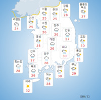 26일인 목요일은 전남권과 경남권을 중심으로 낮 최고기온이 30도 이상 오르며 덥겠다.이날 중부지방은 북쪽을 지나는 기압골의 영향을 받겠고, 그 밖의 지역은 북태평양 고기압의 가장자리에 들겠다. 이에 따라 남해안을 중심으로 천둥‧번개를 동반한 시간당 30mm 내외의 강