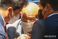 경호인력의 부축을 받으며 재판정에 들어선 전두환(90) 전 대통령이 호흡곤란을 호소하다, 재판 시작 25분 만에 법정을 나갔다. 광주지법 형사1부(부장판사 김재근)는 9일 오후 2시 전 전 대통령의 사자명예훼손 혐의 항소심 공판을 열었다. 1심서 징역