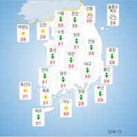 수요일인 11일은 전국에 구름이 많은 가운데 일부 지역에서 소나기가 내리겠다.이날 전국은 서해상에 위치한 고기압의 가장자리에 들겠다. 제주도는 기압골의 영향을 받아 시간당 20~80mm의 소나기가 내릴 것으로 보인다. 강원 내륙과 산지, 경북 북동 산지에서도 대기불안정
