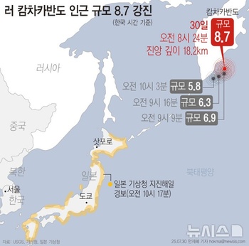 러 캄차카반도서 연이은 초강진 … 러·日·美, 쓰나미 경보-주의보 발령
