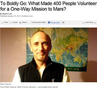 '돌아올 수 없는 화성여행' 지원자수가 400명이 넘었다는 소식이 전해지면서 화제가 되고 있다. 최근 미국 폭스뉴스의 우주저널 특별판에서는 향후 20년 안에 민간 자금으로 편도 화성여행이 가능해질 것이라며 과학적 근거를 제시하고 지원자를 모집한 결과 400명이 넘는 신