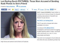 아들 친구에게 자신의 10대 시절 누드사진을 보낸 여성이 경찰에 검거됐다.미 CBS는 14일 자신의 누드사진을 16살 된 아들 친구에게 보낸 로리 달링 데이비드(37)가 텍사스주 해리스 카운티 교도소에 구속 수감됐다고 전했다.
