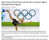 24일 오후 1시(이하 한국시간) 캐나다 퍼시픽 콜리세움에서 열린 2010 밴쿠버 올림픽 피겨스케이팅 여자 싱글 쇼트프로그램 경기에 23번째로 출전, 총점 78.5점으로 세계최고기록을 수립하며 1위에 올라선 김연아에 대해 외신들도 관련 기사를 톱기사로 배치하는 등 높은