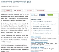 캐나다 밴쿠버 동계올림픽에서 26일 한국의 피겨 영웅 김연아가 금메달을 획득한 것에 대해 중국 언론은 차분한 가운데서도 부럽다는 반응을 보였다. 중국 언론이 자국 선수단의 메달 획득 소식은 떠들썩하게 보도하는 반면 다른 나라의 메달획득 소식은 거의 전하지 않아 왔