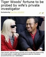 타이거 우즈(34)의 아내 엘린 노르데그린(30)이 우즈의 재산내역을 파악하기 위해 사설탐정을 고용했다고 영국 미러지가 4일 보도했다. 이는 이혼절차를 밟기 위한 수순 아니냐는 의혹이 제기되고 있다.우즈 아내가 사설탐정을 고용했다고 보도했다. 보도에 따르면 노르데그린은