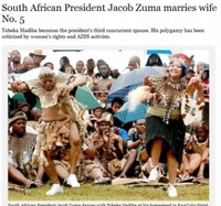 4일(현지시간) 제이콥 주마(67) 남아공 대통령의 5번째 결혼식이 열렸다고 LA타임즈가 5일 보도했다. 남아공은 일부다처제를 헌법으로 보장하는 국가라 합법적으로 남성이 여러 부인을 둘 수 있다.칠순을 앞둔 주마 대통령은 30살 연하의 여성과 줄루족 전통의식으로 결혼식