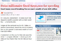 스위스 동부 세인트 갈렌의 한 법원이 부자 스피드광에게 과속운전 벌금을 29만 달러( 3억 2000만원)나 부과했다고 MSNBC가 7일(현지 시간) 보도했다. 문제의 판결을 내린 판사는 “이 스피드 광의 재산이 2000만 달러가 넘어 이 정도의 벌금을 부과해도 괜찮다”