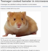 지난해 햄스터를 믹서기에 넣고 돌려 갈아죽이는 끔찍한 영상물이 국내 인터넷상에 공개돼 충격을 던져줬던 가운데 이번엔 멀리 영국에서 한 10대 소년이 자신이 키우던 햄스터를 전자레인지에 넣어 잔인하게 죽인 사건이 뒤늦게 알려져 네티즌을 경악케 하고 있다.영국 일간지 텔레
