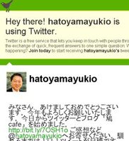 하토야마 유키오(鳩山由紀夫) 일본 총리가 새해 첫 날 인터넷 단문메시지인 '트위터'를 시작했다.하토야마 총리는 1일 오전 자신의 트위터(twitter.com/hatoyamayukio)를 개설하고 새해인사와 함께 "오늘부터 트위터와 블로그 '하토(鳩) 카페'를 시작한다"