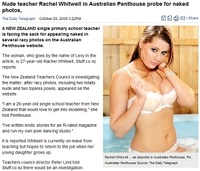 뉴질랜드의 한 젊은 여교사가 포르노 사이트에 자신의 누드 사진을 올리며 "현재 봉춤 스튜디오"를 운영하고 있다는 글을 올려 논란이 일고 있다.영국 일간지 데일리텔레그래프는 26일(현지시각) "뉴질랜드 오클랜드 남부 오타라 지역에 위치한 초등학교 여교사 레이첼 위트웰(R