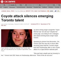 캐나다의 전도 유망한 10대 포크송 여가수가 코요테에 물려 숨지는 사건이 발생했다.캐나다 언론매체인 CBC뉴스는 28일(현지시각) "포크가수 겸 작사가 테일러 미첼(Taylor Mitchell·19)이 캐나다 국립공원에서 코요테 2마리의 공격을 받고 병원으로 옮겨졌으나