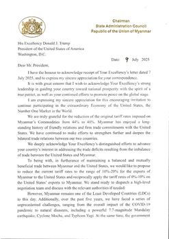 도널드 트럼프 미국 대통령으로부터 40%의 상호 관세를 맞고도 감사를 표시하는 나라가 나왔다. 주인공은 바로 미얀마. 12일(현지시간) AFP통신은 미얀마 군사정권 수장인 민 아웅 흘라잉 최고사령관이 트럼프 대통령의 서한에 대한 자신의 답장을 미얀마어·영어로