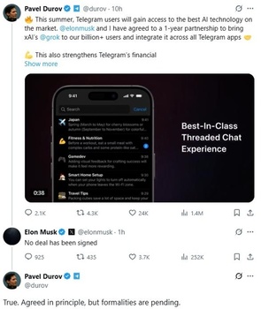 파벨 두로프 텔레그램 CEO가 일론 머스크의 AI 스타트업 xAI와 사업을 협력하기로 했다고 28일(현지시각) 발표했다.하지만 머스크 CEO는 어떤 거래에도 서명이 이뤄지지 않았다면서 두로프 CEO의 앞서 나간 발표에 불편한 심기를 드러냈다.두로프 CEO는 이날 오전