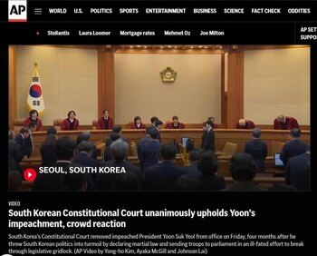 헌법재판소가 4일 윤석열 대통령의 파면을 결정하자 주요 외신들이 이 소식을 일제히 주요 기사로 신속하게 다뤘다.이날 로이터 통신은 "한국의 헌법재판소가 윤석열 대통령을 파면했다"고 보도했다.같은 날 AP통신은 "윤 대통령이 입법적 교착 상태를 타개하겠다는 계엄 시도로