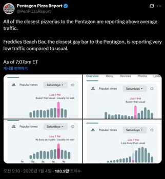 미국이 니콜라스 마두로 베네수엘라 대통령을 전격 체포하기 위해 비밀 군사작전을 감행한 가운데, 이 작전 직전 미국 국방부 건물인 펜타곤 인근의 피자 주문량이 급증해 심상치 않은 낌새를 보였다는 분석이 나왔다.사회관계망서비스(SNS) 엑스(X, 옛 트위터)의 펜타곤 피자