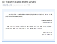 중국이 오는 18일부터 우리 국민에 대한 단기비자 발급을 재개한다. 중국이 우리 국민에 대한 비자발급을 중단한 지 40일만이며, 우리나라가 중국발 입국자에 대한 단기비자 발급을 재개한 지 나흘 만이다.주한중국대사관 및 총영사관은 15일 오전 소셜미디어 공식 계정을 통해