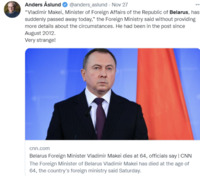 러시아의 우방국 벨라루스의 외무장관이 돌연사했다. 명확한 사인이 밝혀지지 않아 그의 죽음을 둘러싼 미스터리가 증폭하고 있는 가운데 러시아가 배후에 있다는 의혹이 제기되고 있다.지난달 26일 벨라루스 국영 통신사 벨타에 따르면 벨라루스 외무부는 "블라디미르 마케이 외무부