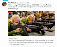 스웨덴·핀란드의 북대서양조약기구(NATO·나토) 가입을 두고 러시아와 서방이 대조적인 반응을 보이고 있다. 서방국가들은 스웨덴과 핀란드의 나토 가입신청을 환영하는 분위기다. 반면 러시아는 스웨덴과 핀란드가 나토 가입 시 발트해에 핵무기를 배치하고 북방함대를 강화하겠다고