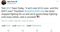 미국 주류 언론들은 지난 8일(이하 현지시간) “도널드 트럼프 대통령의 주변 사람들이 대선 결과에 승복하라고 권유하고 있다”는 내용을 전했다. 그러나 9일부터 나오는 이야기는 다르다. 마이크 펜스 부통령과 멜라니아 트럼프 여사부터 공화당 주요 인사들까지 “끝날 때까지