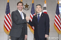 정경두 국방장관과 마크 에스퍼 미국 국방장관이 9일 국방부에서 2시간 동안 비공개 회담을 가졌다. 국방부 공식 발표에 다르면 “한미동맹 주요 현안에 대해 논의했다”는 것이지만 실제로는 한일 군사정보보호협정(GSOMIA)과 호르무즈해협 파병에 대해 논의한 것으로 전해졌다