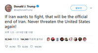 도널드 트럼프 미 대통령이 트윗을 통해 이란에 “다시는 미국을 협박하지 마라”고 경고했다. 트럼프 대통령은 19일(이하 현지시간) 자신의 트위터에 “이란이 싸우기를 원한다면, 그때는 공식적인 이란의 종말이 될 것”이라며 이 같이 경고했다. 트럼프 대통령의 경고 이후 세