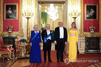 영국에서 외국 정상으로는 두 차례 국빈 초청을 받은 도널드 트럼프 대통령이 17일(현지시각) 저녁 윈저성에서 찰스 3세 영국 국왕이 마련한 국빈 만찬에 참석했다. 2019년 6월 고(故) 엘리자베스 2세가 버킹엄궁에서 트럼프 대통령을 위해 주최한 만찬에 이어 두 번째