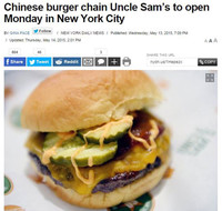 중국의 햄버거 브랜드가 미국 뉴욕 맨해튼 한복판에 매장을 오픈을 앞두고 있지만 이를 바라보는 미국인들의 시선은 곱지 않다.미국의 한 매체는 지난 14일 중국 햄버거 체인 '엉클샘'이 오는 18일부터 미국 패션의 상징인 5번가에서 영업을 시작한다고 보도했다.'햄버거