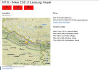 25일 정오(현지시간) 네팔 카트만두 남동쪽 150km 지점에 있는 치트완 주변 람중 인근에서 진도 약 7.8의 지진이 발생했다. 외신들에 따르면, 이 지진으로 현지에서 100여 명 이상이 숨지고, 수백여 명이 부상을 입었다고 한다. 한국인 1명도 부상을 입은 것이 확