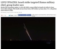20일 0시(한국 시간 20일 오전 6시)까지 한시적으로 이뤄졌던 이스라엘과 하마스 간의 휴전이 하마스의 기습 로켓 공격으로 깨졌다. 이스라엘은 즉각 반격에 나섰다고 한다. 美워싱턴포스트(WP) 등 외신들은 현지 매체들을 인용해 휴전이 파기되었다는 소식을 전했다. 현지