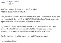 말레이시아 항공사는 295명을 태운 말레이시아 여객기 보잉777 여객기가 18일 새벽(현지시간) 러시아 국경 근처 우크라이나에서 추락했음을 밝혔다.말레이시아 여객기 항공사는 공식 트위터를 통해 "MH17(말레이시아 보잉777 여객기)과 교신이 끊겼다"며 "확인된