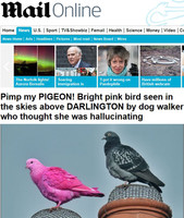 화려한 모습의 분홍색 비둘기 포착됐다. 영국 데일리메일 인터넷판은 27일(현지시각) 잉글랜드 북동부 더럼 달링턴 지역의 한 철교 밑에서 포착된 분홍색 비둘기 사진을 공개했다. 당시 분홍색 비둘기를 발견한 행인은 "내 눈을 믿을 수 없었다"며 "비둘기를 보고 다시 한 번