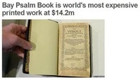 17세기 청교도 정착민들이 만든 미국 최초의 인쇄 도서 [베이 시편집]이 무려 150억에 팔렸다. 26일(현지시간) 미국 뉴욕의 소더비 경매에서 600만 달러로 시작한 [베이 시편집]은 경매 5분 만에 투자회사 칼라일그룹의 공동 창업자인 데이비드 루벤스타인에게 1416