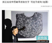중국 최고(最古) 문자가 발견 발견됐다. 지난 9일 중국 광명일보 등 현지 언론은 중국 고고학자들이 저장성 핑후(平湖)시 좡차오(庄橋) 고분 유적지에서 각종 부호가 새겨진 돌도끼를 발견했다고 보도했다. 이번에 발견된 문자는 중국에서 가장 오래된 문자인 갑골문자(甲骨文字