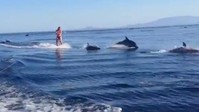 비키니 차림으로 웨이크보드를 즐기는 미녀의 주변에서 재롱부리는 돌고래 무리의 모습이 화제다.유튜브에 올라온 이 영상은 미국 캘리포니아 만에서 촬영된 것으로 한 여성이 모터보트와 연결된 줄을 잡고 빠른 속도로 파도를 가르며 웨이크보드를 즐기는 모습이 담겨 있다. 그때