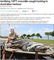 호주에서 길이가 4m에 이르는 거대 바다악어가 잡혀 화제다.영국 일간지 데일리메일은 6일 한 공원 관리원이 포획한 바다악어와 함께 찍은 사진을 공개했다.이 바다악어는 길이만 거대한 것이 아니다.신문에 따르면 바다악어의 몸무게는 무려 900kg.화제의 악어는 호주 노던