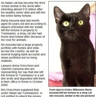 180억 상속 고양이가 등장했다.12일 영국의 데일리 메일은 "이탈리아에 주인으로부터 180억원의 유산을 상속받은 고양이가 세계 3번째 부자 애완동물에 등극했다"고 보도했다. 이 180억 상속 고양이의 이름은 '토마시노'며 주인없이 로마를 떠돌아 다니다가 지난 11월